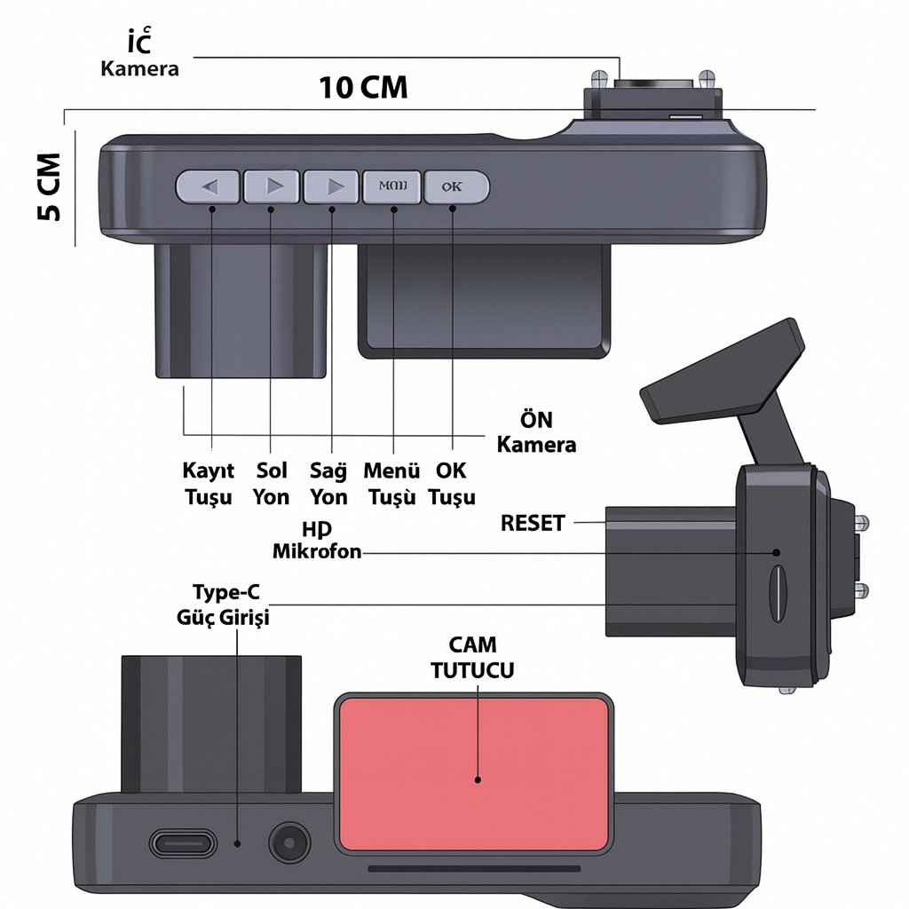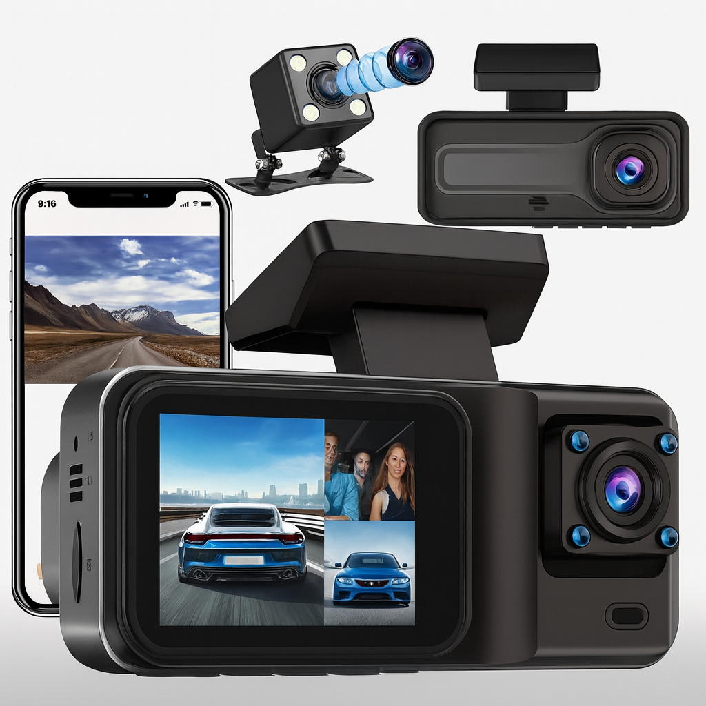 Bu gelişmiş 3 Kanallı Ultra HD Araç Kamerası, ön, iç ve arka kameraları ile her açıdan kayıt alır.